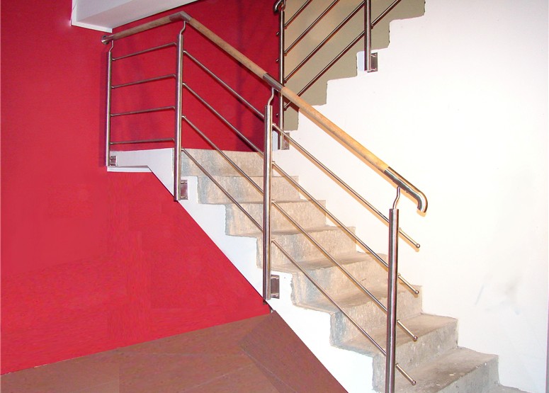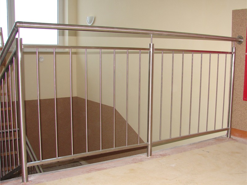 Balustrada nierdzewna przed wejściem do budynku. Wypełnieniem są pionowe pręty.