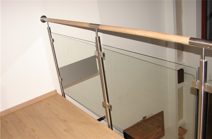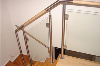 Balustrada nierdzewna w połączeniu z drewnem dębowym w której wypełnieniem jest szkło bezpieczne.