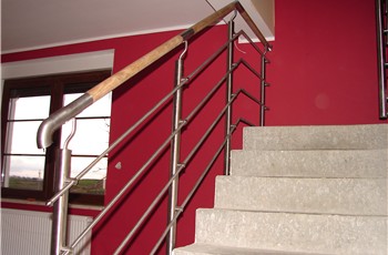 Poręcz przy schodach przechodząca na wyższych stopniach w balustradę.